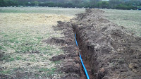 Work began today on digging a trench for putting in the new water pipe and the electric cable to work the new pump. Once the trench is completed we have to line the bottom with sand. Next the water pipe is laid then another layer of sand on the top followed by the electric cable and finally more sand before filling the trench back in. We are having two tanks installed, one for the farm